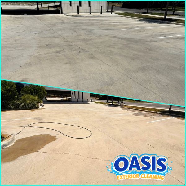 At Oasis Exterior Cleaning LLC, we specialize in deep cleaning parking lots to keep your property looking spotless and professional. Our process removes stubborn tire marks, oil and gas stains, organic growth, and everyday buildup that dulls your pavement. By using advanced pressure washing and eco-friendly solutions, we not only restore the appearance of your lot but also help improve safety, reduce slip hazards, and extend the life of your pavement.